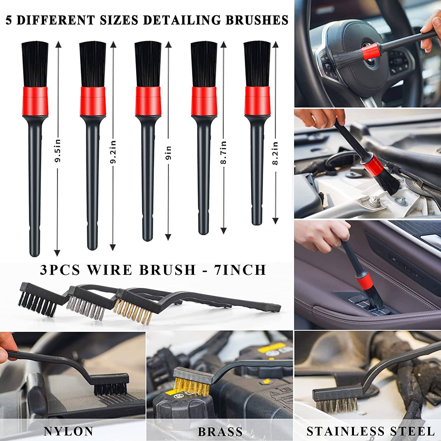 Cepillos para detalles y cepillos de alambre: 5 cepillos para detalles de diferentes tamaños, satisfacen todo lo que necesita para la limpieza detallada. Suficiente longitud para explorar y alcanzar fácilmente las pequeñas grietas, los rincones, las tuercas de las ruedas o los espacios reducidos. Los pinceles para detalles son lo suficientemente suaves como para no dejar marcas de arañazos en la pintura. El juego de cepillos de alambre de 3 piezas incluye cepillo de acero inoxidable, cepillo de latón y cepillo de nailon. Puede ayudarlo a limpiar las manchas difíciles y el óxido, pero tenga cuidado de no dañar su automóvil.