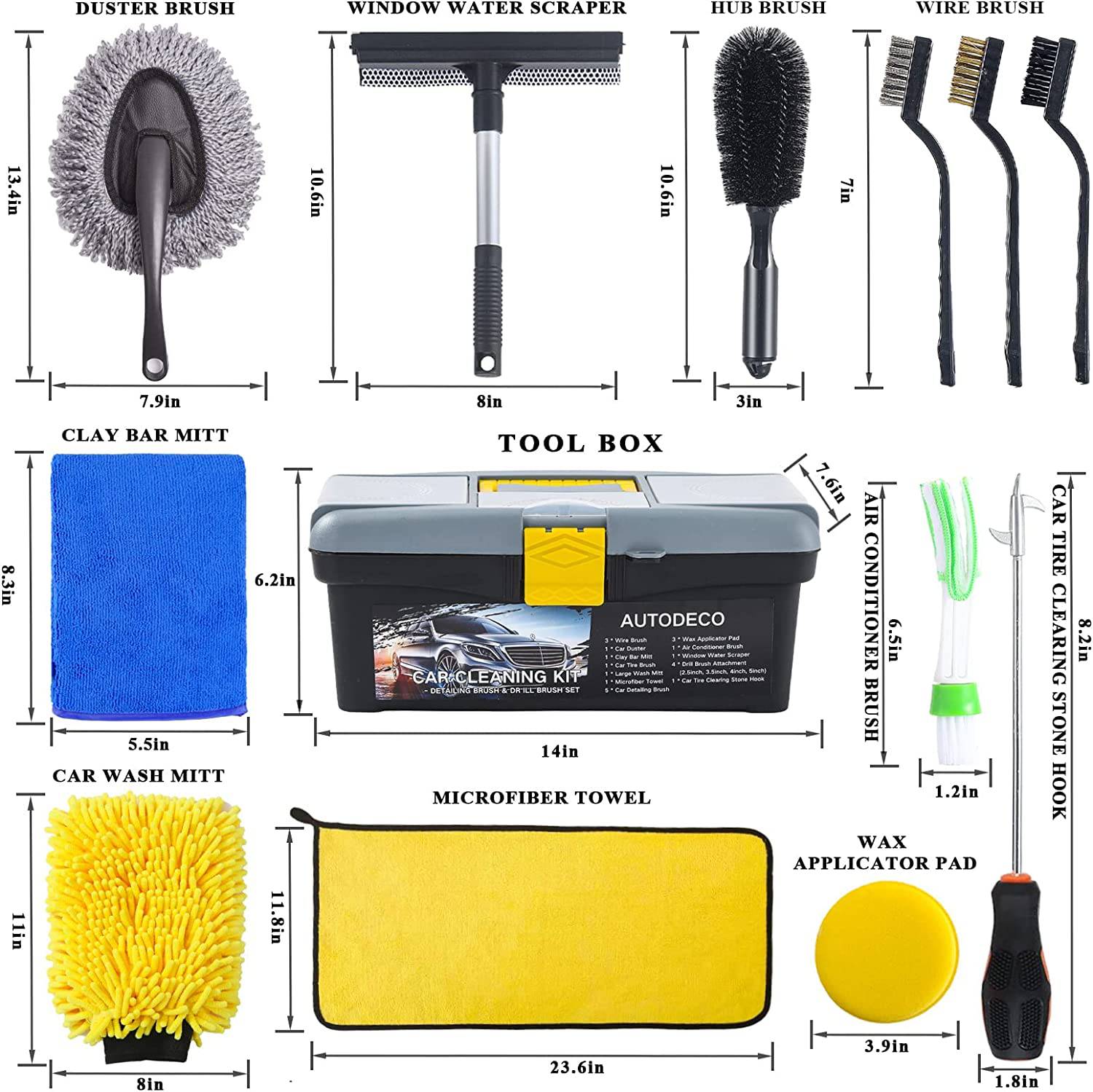 AUTODECO - Juego de 23 herramientas de limpieza para lavado de autos, juego de brochas para taladro de auto, con cepillo para detalles de autos, manopla de lavado, toallas de manopla de arcilla, cepillo para llantas, raspador de ventanas,