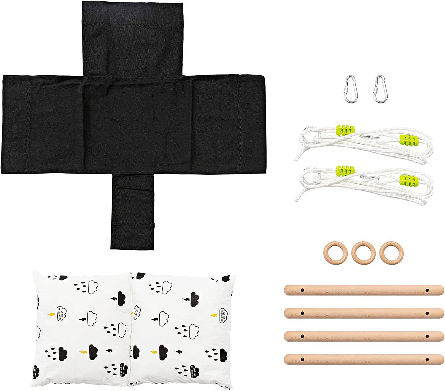 DISEÑO SEGURO: las pruebas estrictas y los materiales naturales de alta calidad, como la tela de lona de algodón, la cuerda de algodón y los mosquetones con cerradura, garantizan que su pequeño se balancee de forma segura.