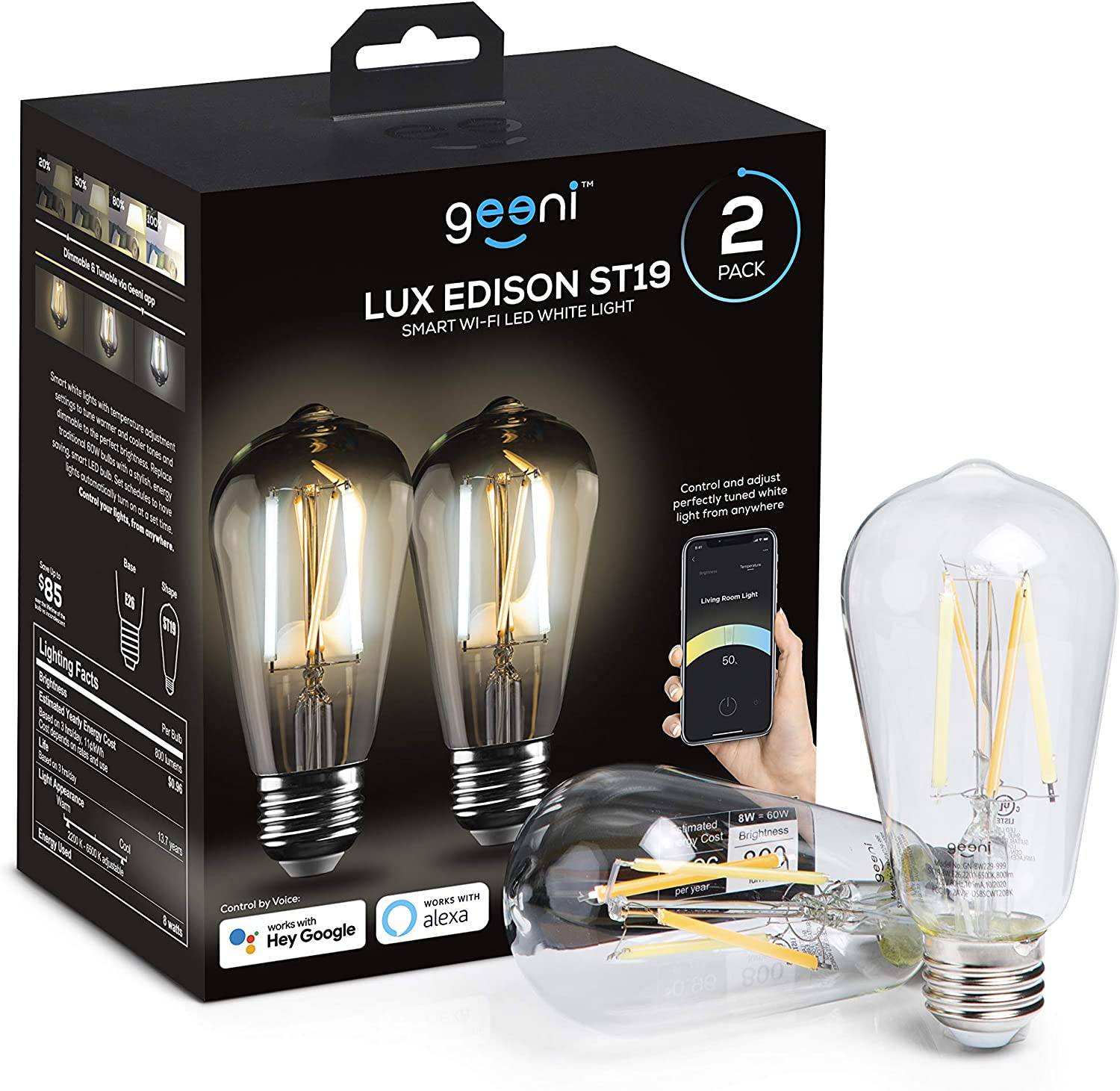 Geeni LUX Edison ST19 Edison WiFi LED Smart Bulb, 2700K - 6500K 8W, base E26, regulable, luz blanca sintonizable, compatible con Amazon Alexa y Google Home, no requiere concentrador, paquete de 2