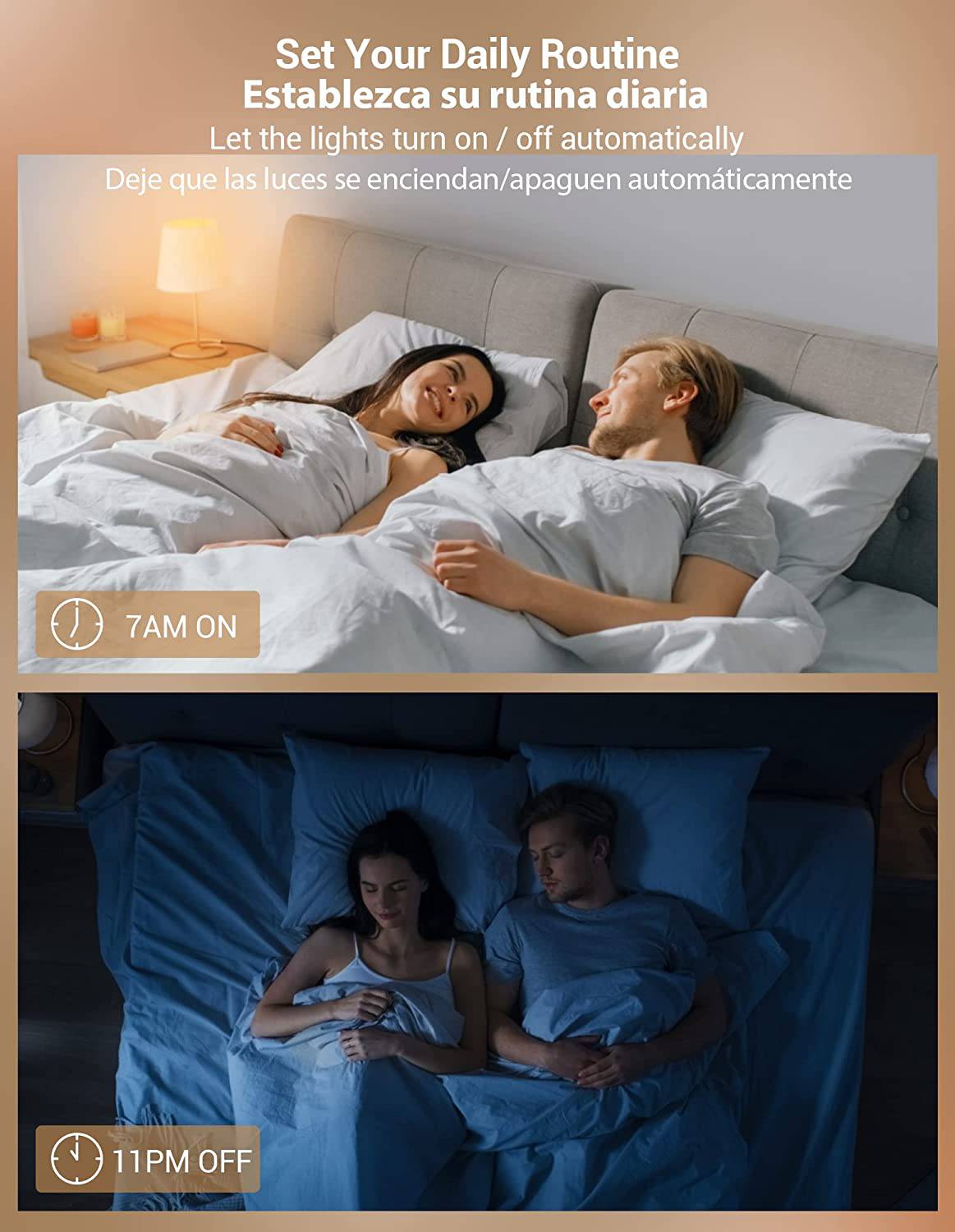 HORARIO DE TIEMPO Y CONTROL DE GRUPO: puede crear horarios para automatizar sus luces inteligentes por la mañana, por la noche o cuando lo desee. Incluso cuando estás fuera de casa o de vacaciones. Y despídete de dormir con alarmas y volver a casa a una casa oscura. Usando la función "Crear grupo" en la aplicación para agrupar bombillas para tener todo el piso de abajo, la sala de estar o el hogar bajo un solo control.
