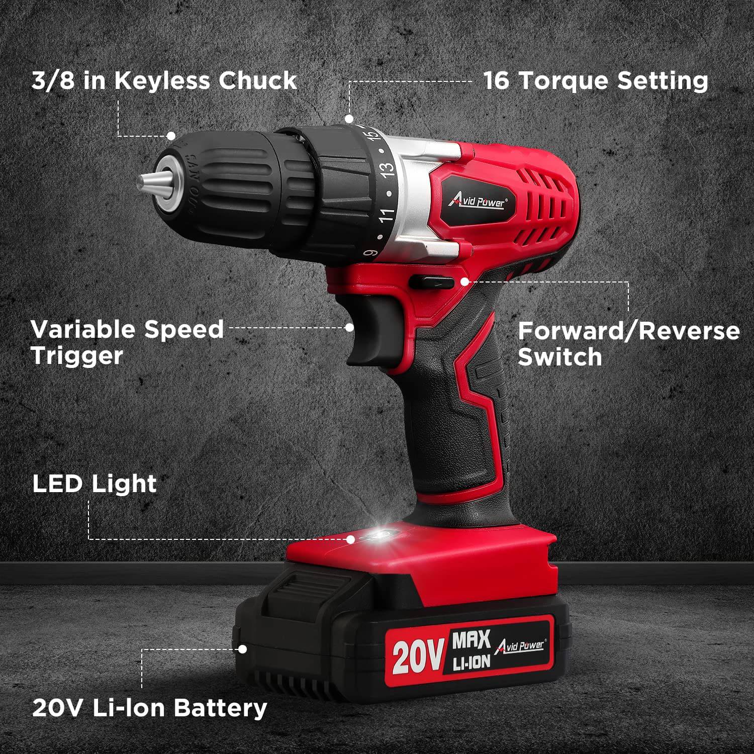 AVID POWER Juego de brocas inalámbricas de litio de 20 V Max, kit de taladro eléctrico con batería y cargador, portabrocas sin llave de 3/8 pulgadas, velocidad variable, 16 posiciones y 22 brocas