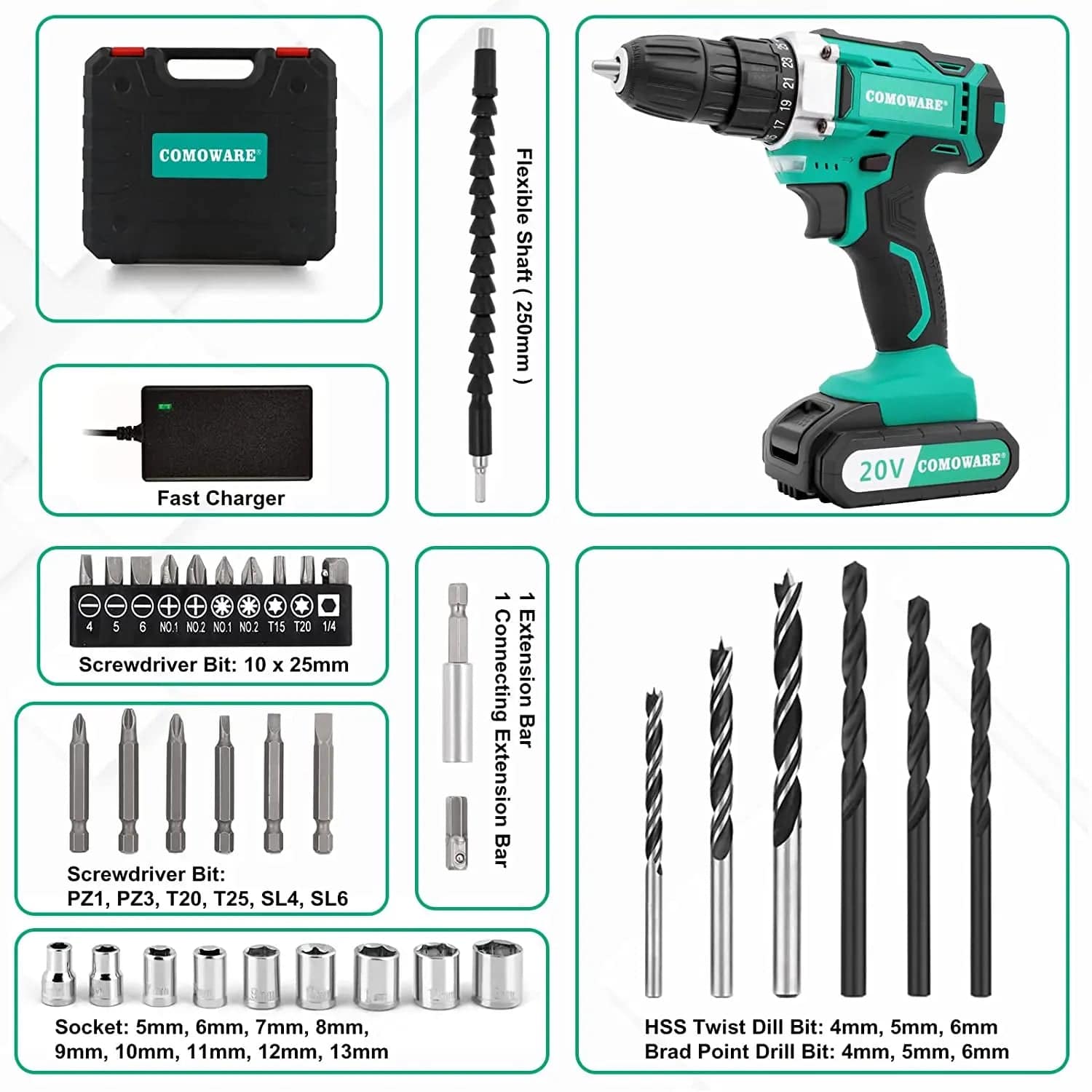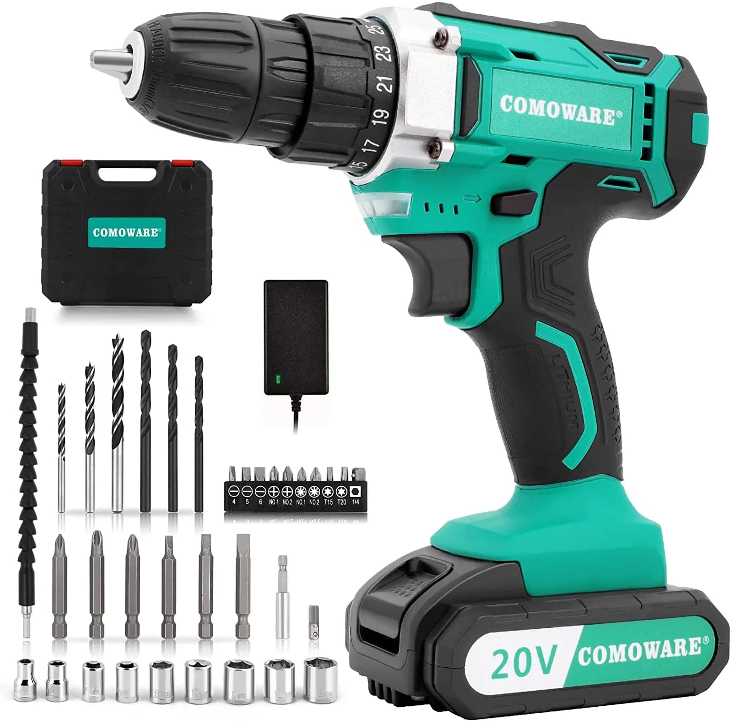COMOWARE Taladro inalámbrico de 20 V, juego de brocas eléctricas con 1 batería y cargador, portabrocas sin llave de 3/8 pulgadas, 2 velocidades variables, par de torsión de 266 en libras, posición 17+1 y 34 brocas de taladro/conductor