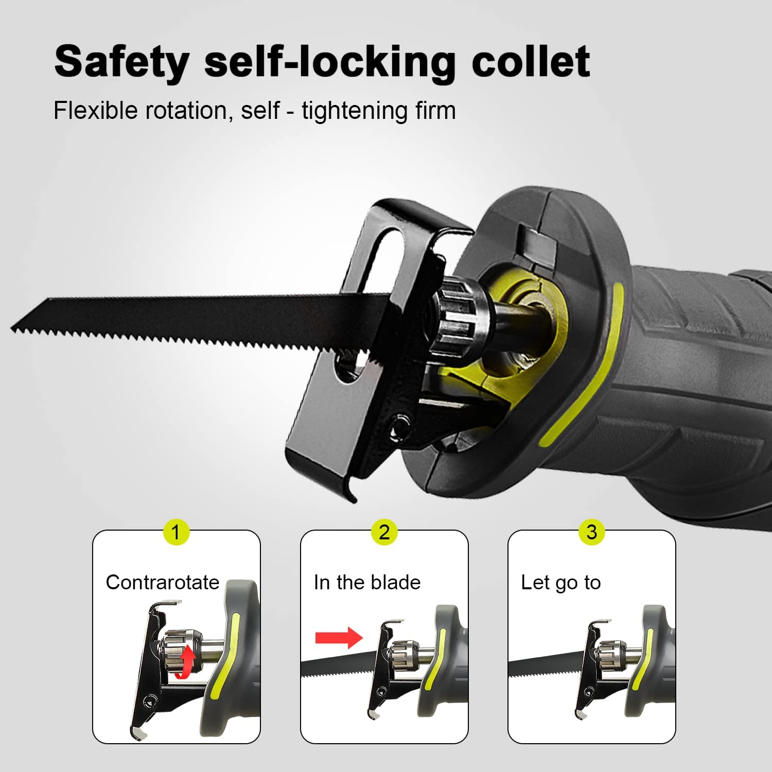 Funcionamiento seguro calificado- Esta sierra recíproca ha desarrollado un sistema de protección de herramienta/batería para un funcionamiento súper seguro. Protección 3 en 1 contra sobrecarga, sobrecalentamiento, sobredescarga. Ayuda a prolongar la vida útil de la herramienta y la batería con un rendimiento duradero.