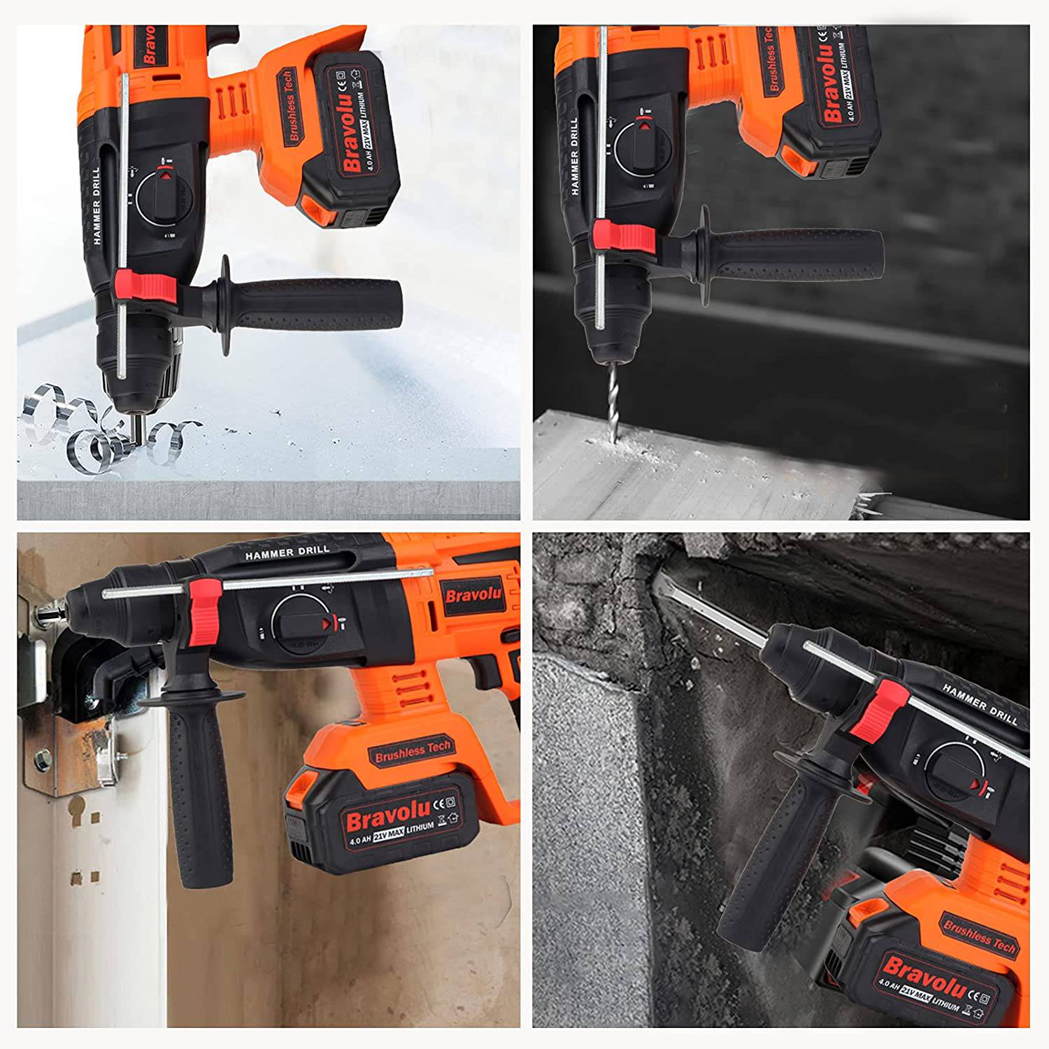 Taladro percutor inalámbrico, Bravolu Brushless 21V 1 pulgada SDS Plus Taladro percutor con 2 baterías de 4.0Ah y cargador rápido, 4 modos y velocidad variable, mango ajustable