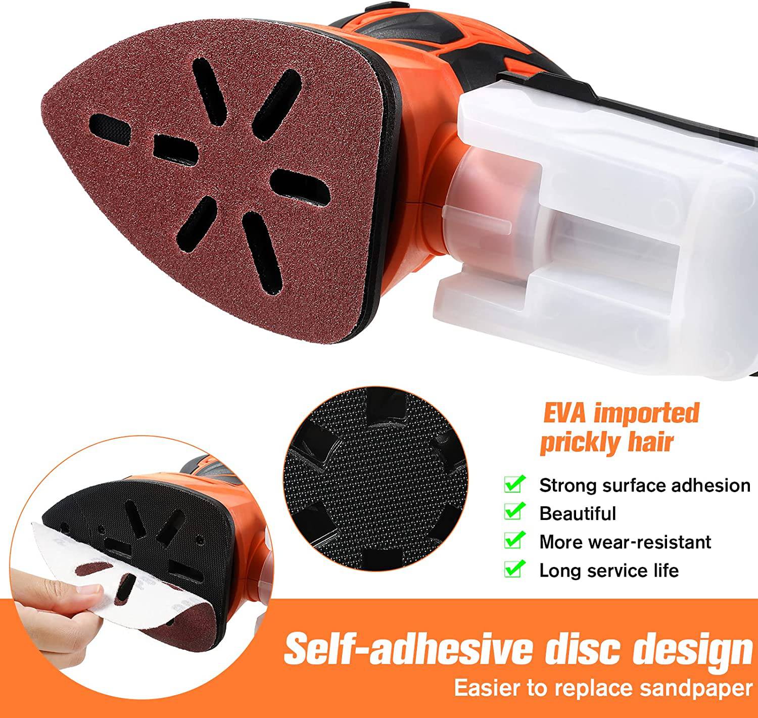 Mantener limpio - La bolsa para el polvo reutilizable mantiene el área de trabajo limpia. El ventilador es impulsado por un motor de cobre puro de alta eficiencia incorporado, que puede girar rápidamente para transportar las astillas de madera a la caja de la bolsa para el polvo. La máquina lijadora puede lijar, alisar, recortar, pulir, quitar pintura, barniz, pulir, manchas, imperfecciones, etc., para satisfacer sus diversas necesidades.