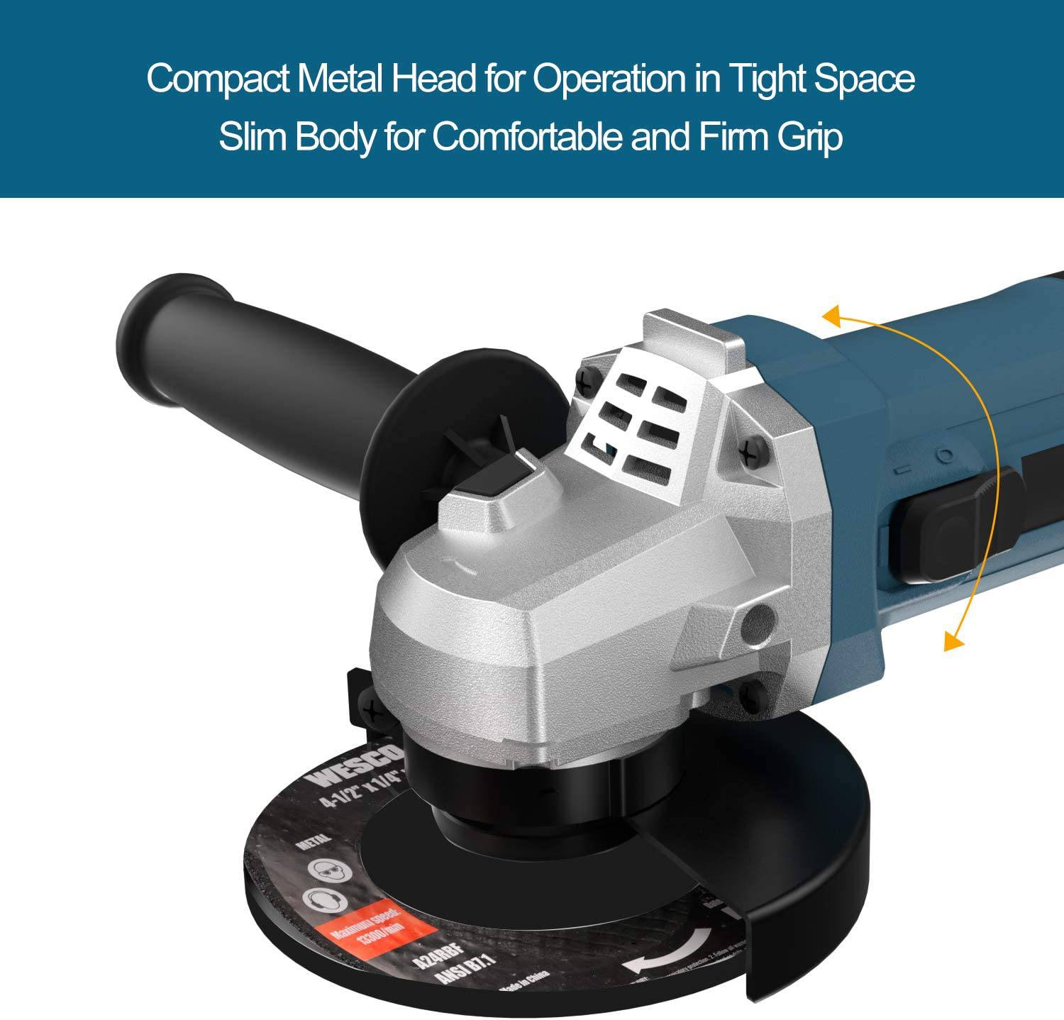 WESCO - Herramienta de amoladora angular de 6 amperios, 11000 RPM, amoladora angular de 4-1/2 pulgadas con mango auxiliar, llave inglesa, protección de seguridad para moler, cortar, 3 ruedas de molienda de metal