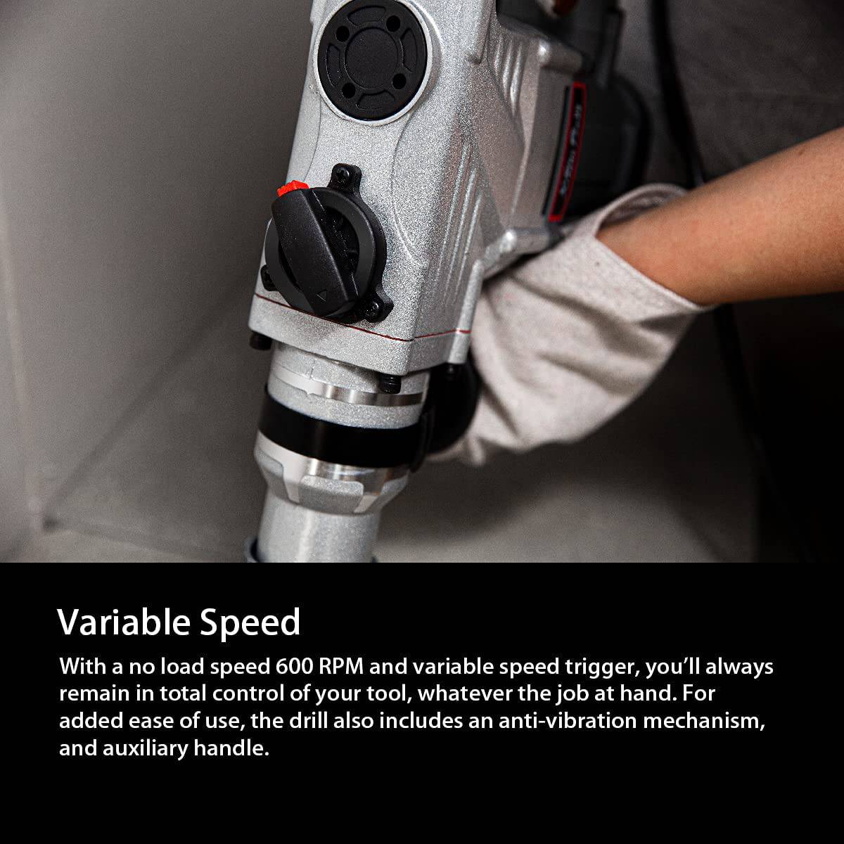Velocidad variable: con una velocidad sin carga de 600 RPM y un disparador de velocidad variable, siempre permanecerá en el control total de tu herramienta, sea cual sea el trabajo a mano. Para mayor facilidad de uso, el taladro también incluye un mecanismo antivibración y mango auxiliar. (Acepta el tipo de bit: SDS Plus)