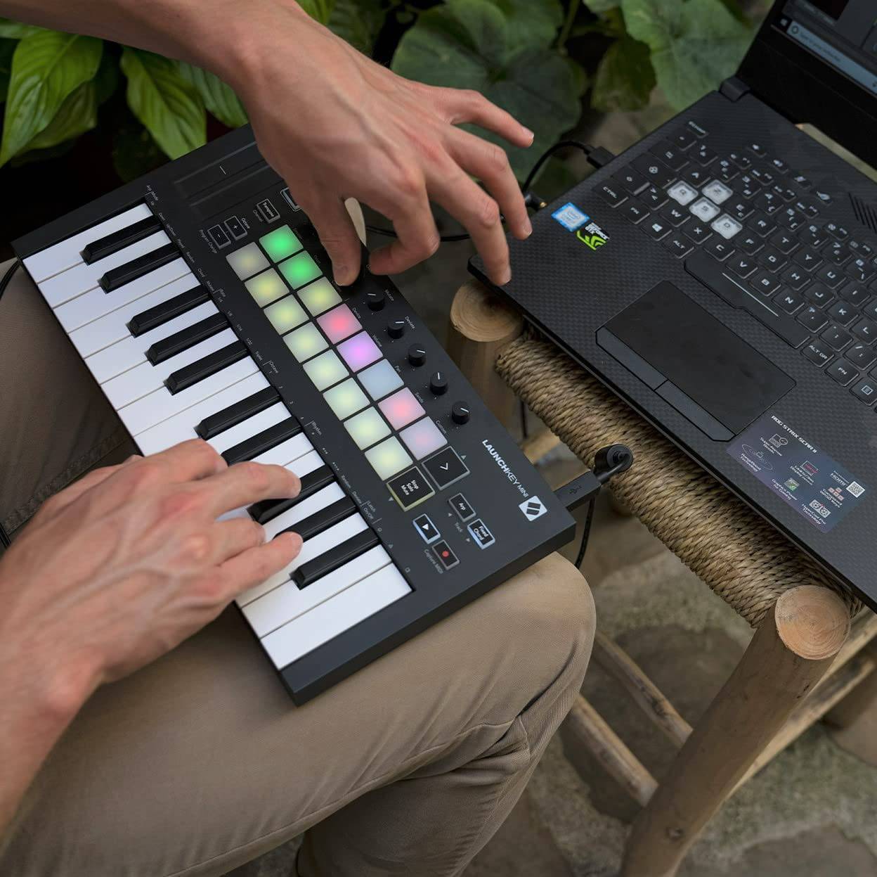 • Launchkey Mini lo acompaña a cualquier lugar: envíe aplicaciones y cambios de programa a sus sintetizadores de hardware con salida MIDI, o agregue teclas a su Groovebox directamente a través de MIDI. El diseño liviano y compacto de Launchkey Mini significa que va a donde quiera que vaya. El hardware funciona con bus, lo que es ideal para viajar y tocar mientras viaja.