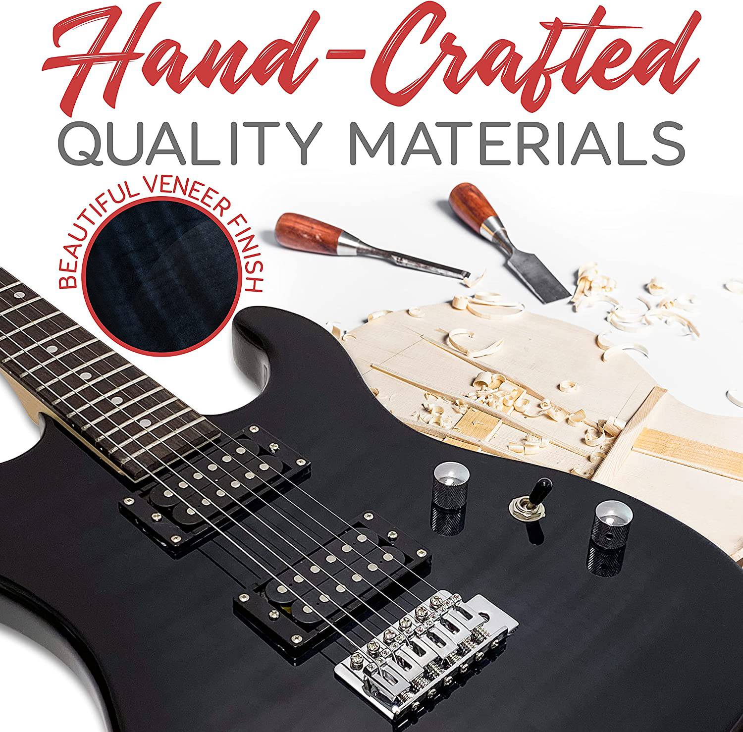 KIT DE INICIO COMPLETO: presenta una guitarra de tamaño estándar a gran escala perfecta para usar en lecciones, bandas, actuaciones o cuando se practica en casa. Incluye amplificador y cable de ¼”, varilla de trémolo, estuche, cuerdas de guitarra, correa para el hombro, afinador digital, púas