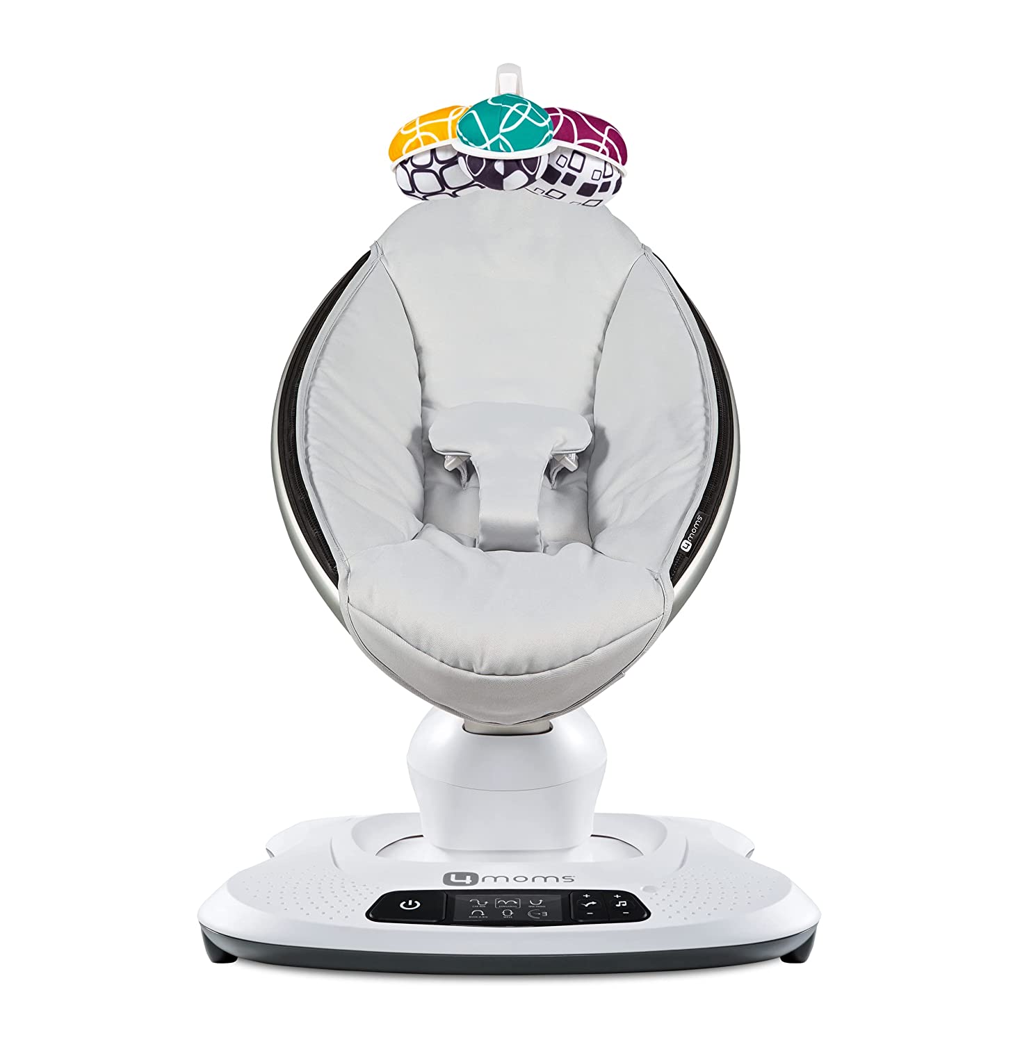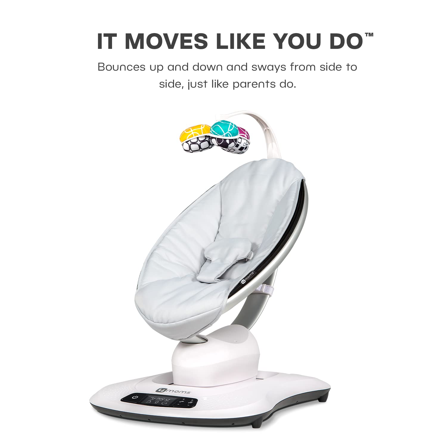 El columpio para bebés con múltiples movimientos MamaRoo4 de 4moms (modelo 1037) rebota hacia arriba y hacia abajo y se balancea de lado a lado, tal como lo hacen los padres cuando tienen a su pequeño en sus brazos. Un espacio seguro para acostar al bebé cuando los padres necesitan un momento, este columpio para bebé cuenta con cinco movimientos inspirados en los padres y cinco velocidades, lo que les permite adaptarse a la variedad de estados de ánimo del bebé. Con 25 combinaciones de movimiento diferentes, una reclinación ajustable, cuatro sonidos incorporados o la capacidad de conectarse a cualquier dispositivo MP3, el bebé puede disfrutar de las melodías mientras se mantiene conectado y activo con su entorno.