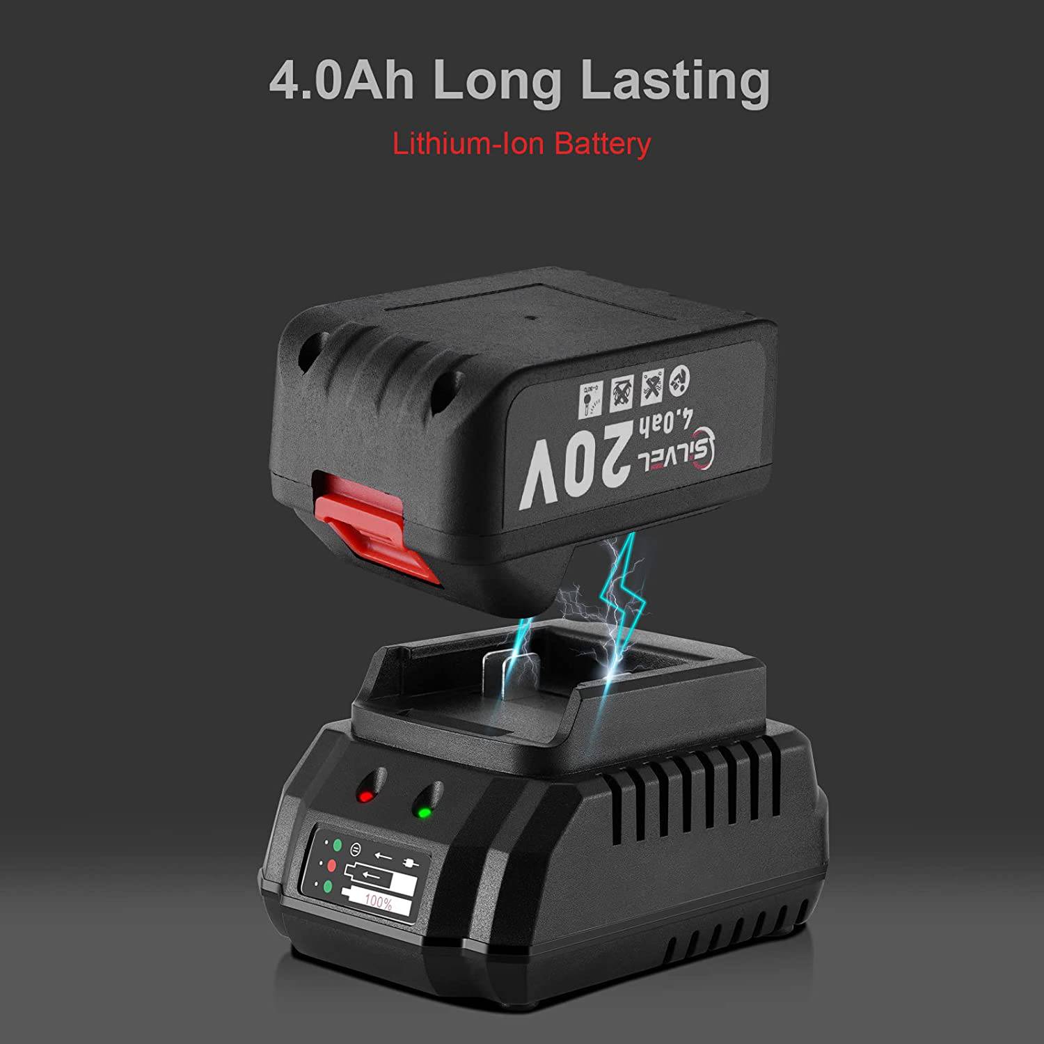 Amoladora angular inalámbrica SILVEL de 20 V, amoladora inalámbrica de 4 pulgadas y 9000 RPM con batería de iones de litio de 4,0 Ah, cargador, mango de 2 posiciones, amoladoras angulares eléctricas para cortar y pulir