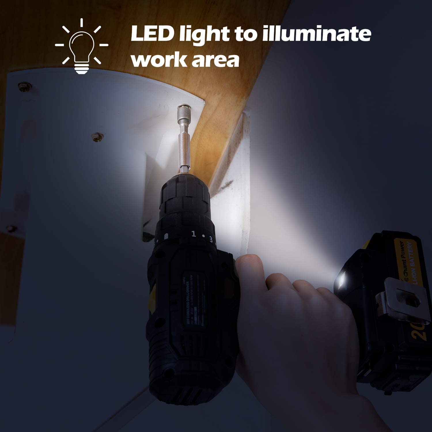 LED integrado y gancho para cinturón extraíble: una luz LED integrada es muy práctica, funciona como una luz de flash para ayudar a centrarte en el punto de taladro cuando se trabaja en entornos oscuros. El clip de cinturón se puede fijar en cualquier lado del mango o colgar de una correa de tela.