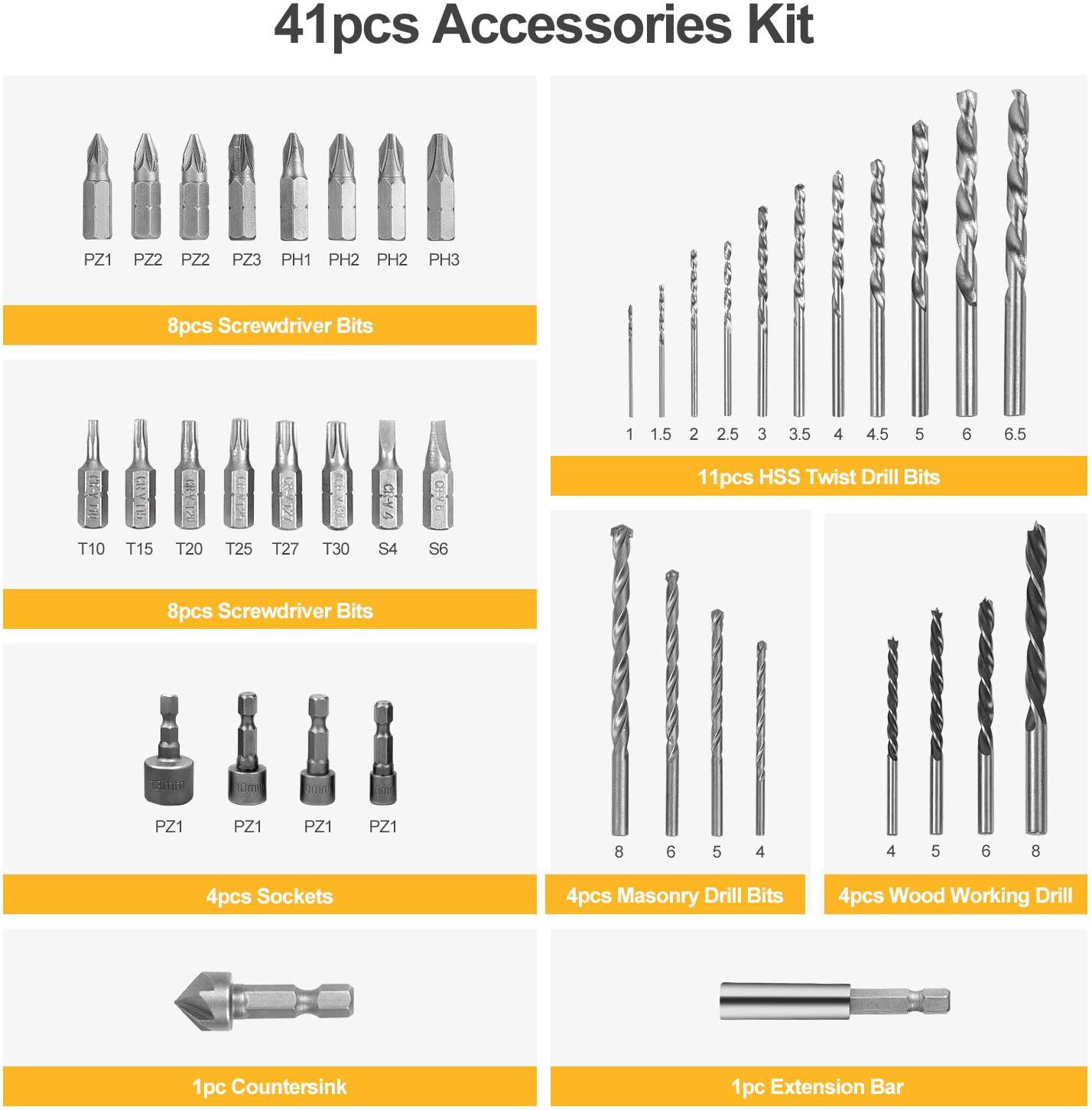 Juego completo de accesorios: 1 taladro inalámbrico de 20 V, 1 batería de iones de litio, 1 cargador de batería, 1 gancho para cinturón, 1 caja de accesorios de plástico, 1 bolsa de nailon, 1 barra de extensión, 1 avellanador, 4 enchufes, 4 taladros de trabajo de madera, 4 brocas de mampostería, 8 puntas de destornillador (T), 8 brocas de destornillador (brocas de destornillador), 11 brocas HSS.