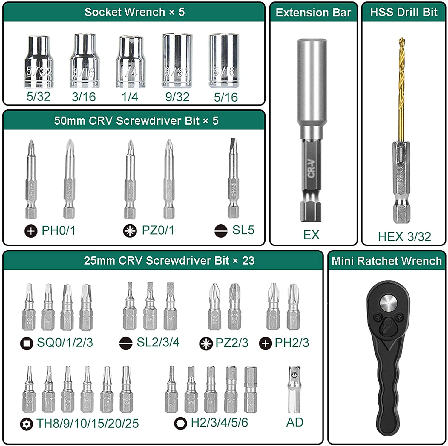 36 ACCESORIOS CON LLAVE DE TRINQUETE- Viene con 36 accesorios que son adecuados para sujetar y aflojar todos los tornillos de los muebles. La llave de carraca es adecuada para espacios estrechos, donde no se puede utilizar el destornillador. El husillo tiene una función de autobloqueo, que proporciona un par mayor cuando se usa manualmente. Se deben usar brocas de 25 mm con varilla de extensión