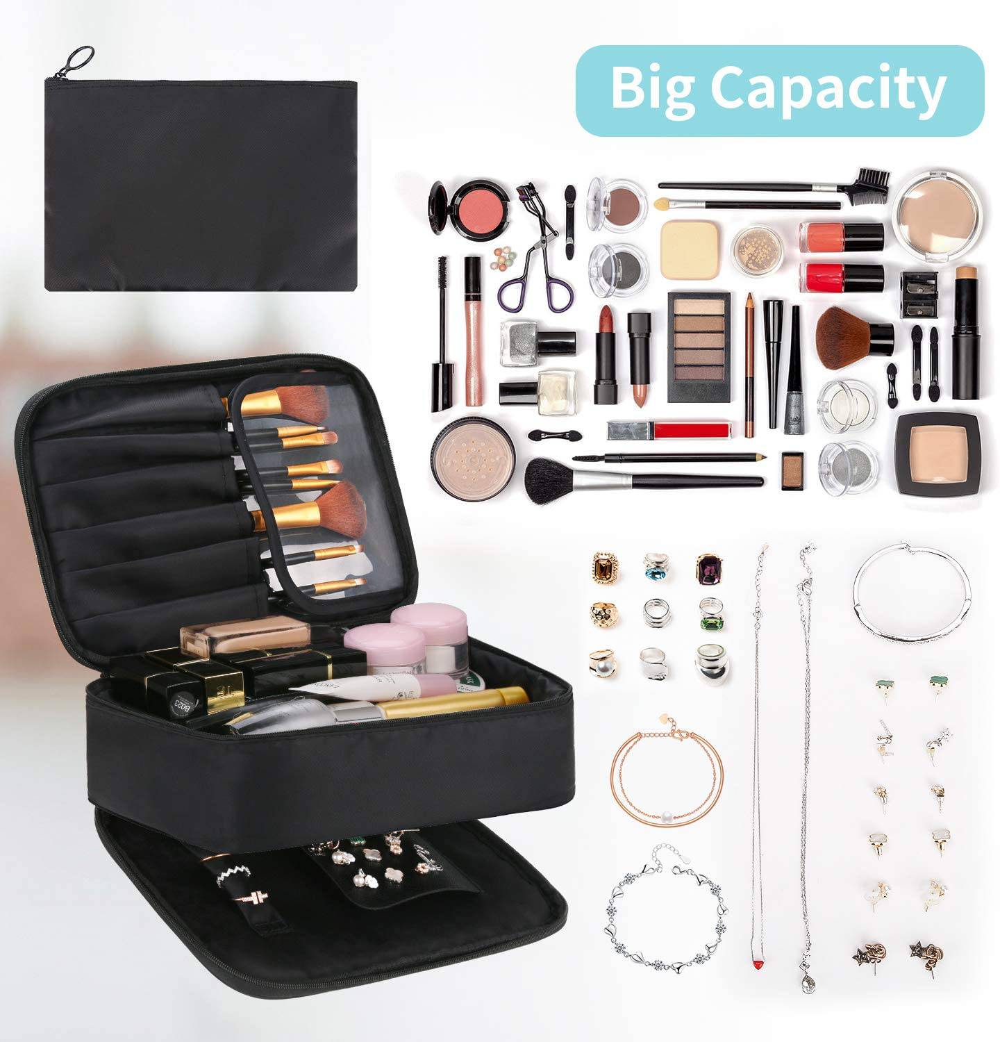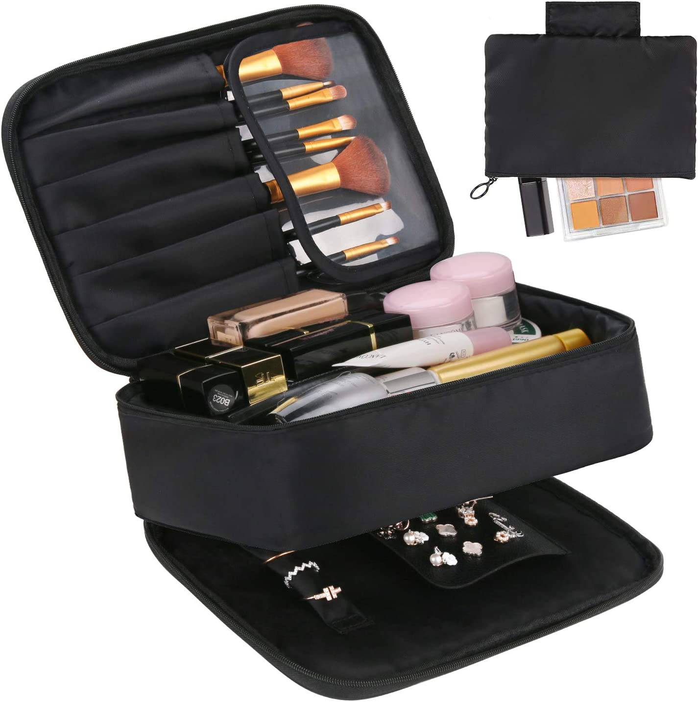 DIMJ - Maletin de maquillaje y joyero para mujer, organizador de viaje 2 en 1 con compartimentos, portátil, resistente al agua, para cosméticos, brochas, collares, pendientes, pulseras, artículos de tocador (negro)