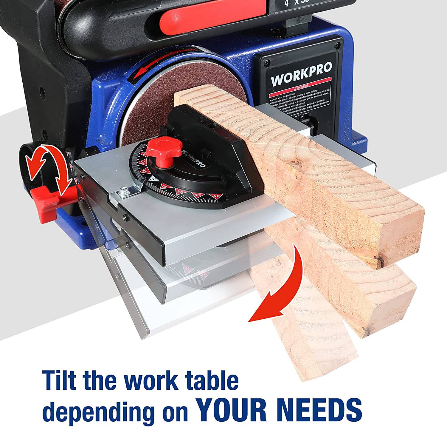 Lijado en varios ángulos: la mesa de trabajo se puede inclinar de 0° a 45° para lijar en bisel. Un calibre de ingletes aumenta la precisión, lo cual se recomienda para lijar superficies de extremos pequeños en el disco de lijado.