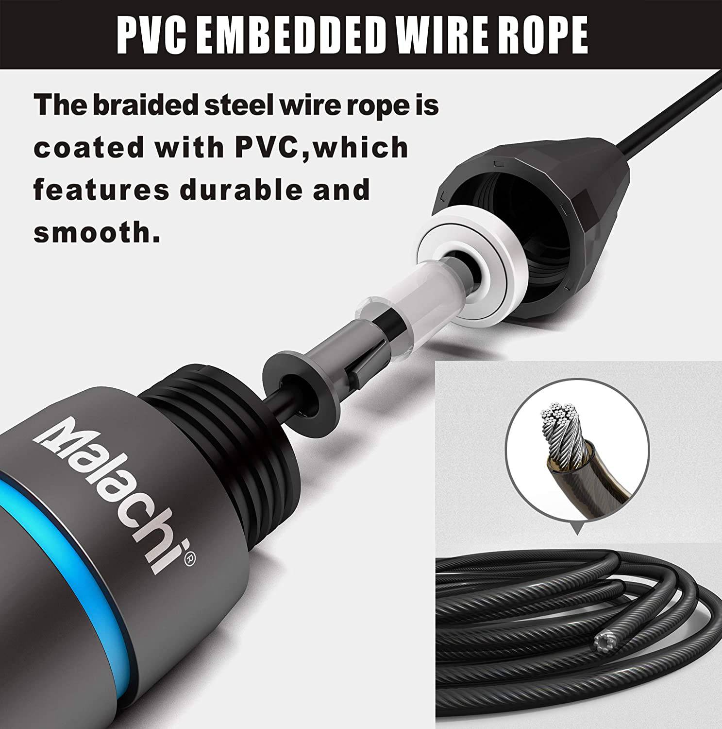 Cable incrustado de PVC: el cable de acero está recubierto con PVC, que se caracteriza por su durabilidad y suavidad, garantiza la máxima vida útil y evita grietas o roturas. Los mangos ergonómicos están bien diseñados para su seguridad y comodidad, están cubiertos con esponjas suaves, lo que hace que los mangos sean cómodos de sostener.