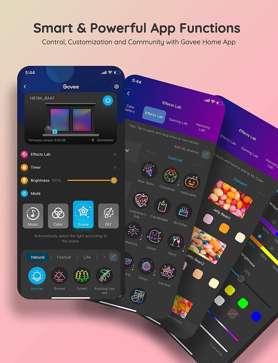 Iluminación de colores de bricolaje: personalice cada uno de los 15 segmentos de tiras de luz para mostrar un color diferente a través de la aplicación Govee Home. Simplemente seleccione sus colores favoritos de la paleta de colores virtual para crear interesantes efectos de luz y una pantalla más colorida.