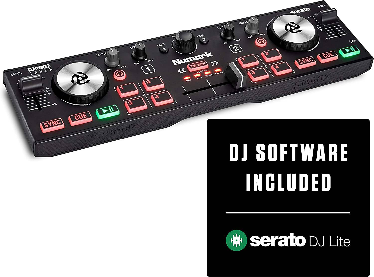 Numark DJ2GO2 Touch - Controlador de DJ USB compacto de 2 decks para Serato DJ con mezclador/crossfader, interfaz de audio y jog wheels táctiles capacitivos