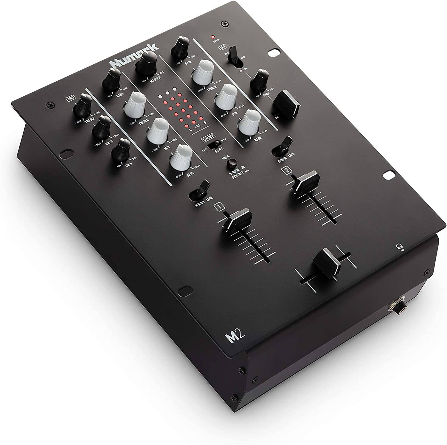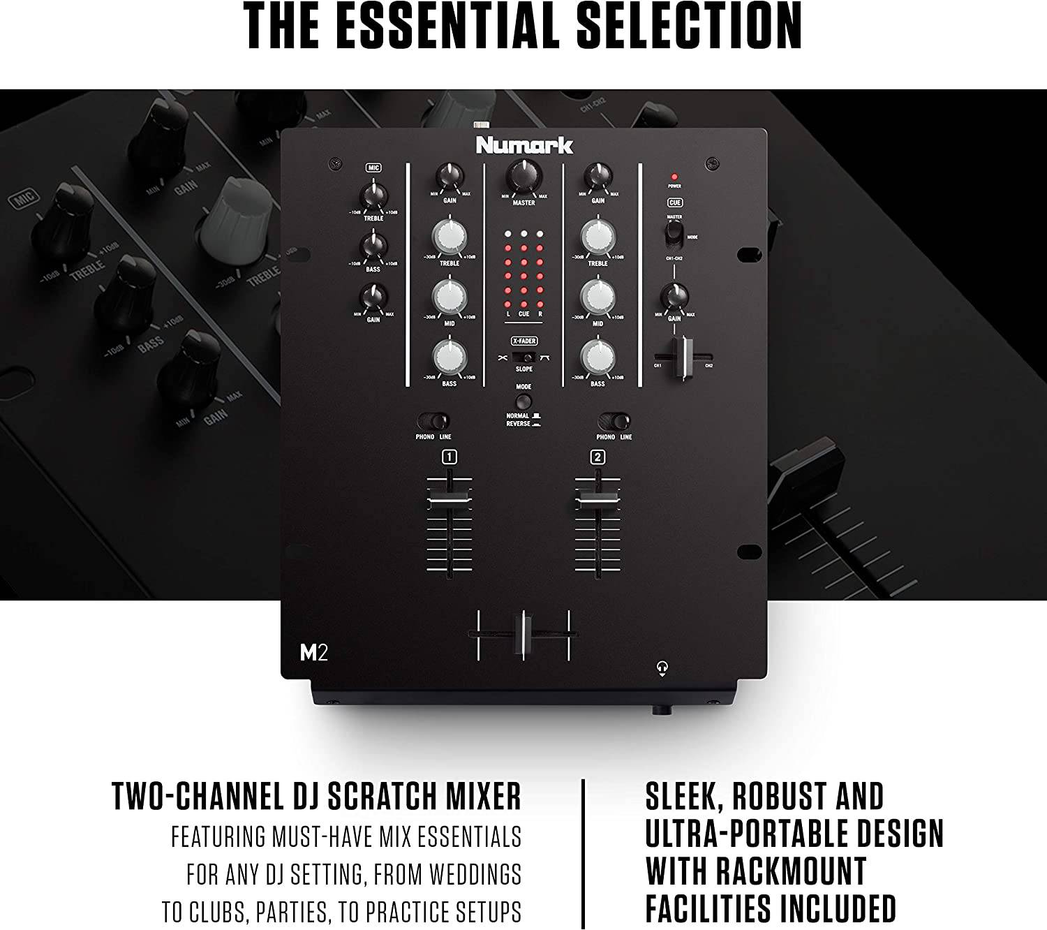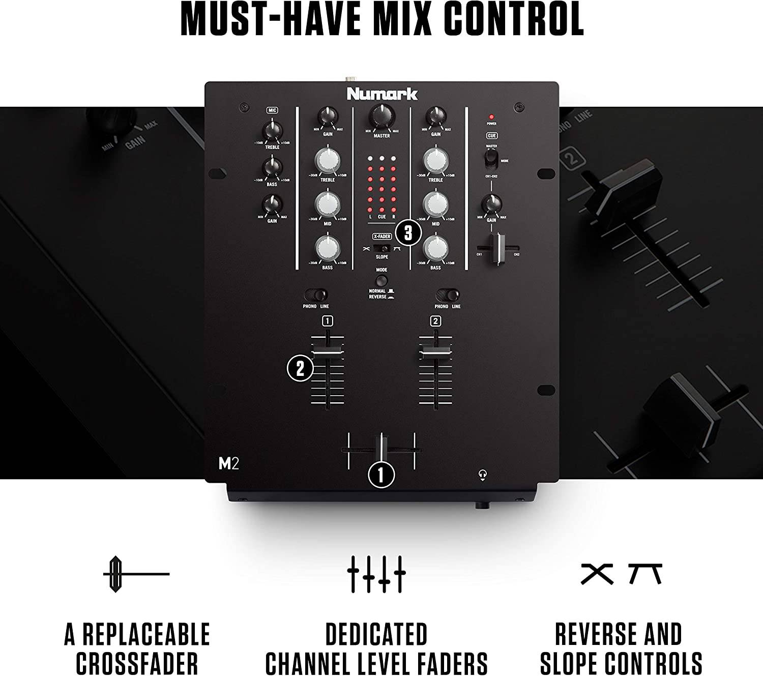 Numark M2 - Mezclador Scratch DJ de 2 canales, montaje en rack con ecualizador de 3 bandas, entrada de micrófono y crossfader reemplazable con controles de inversión y pendiente