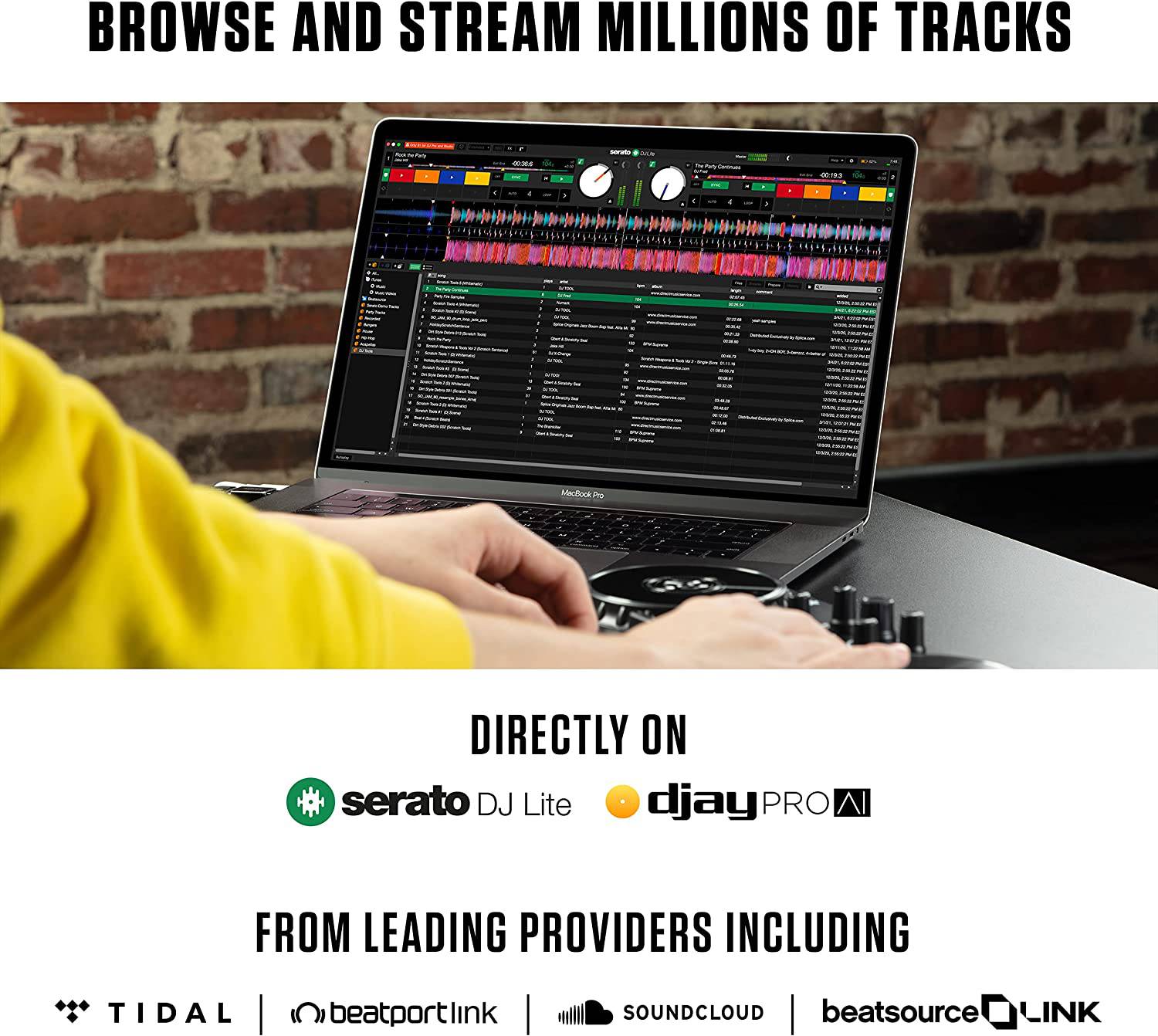 Transmita millones de pistas: transmita toda su música de DJ a través de Serato DJ Lite (incluido) o djay Pro AI de proveedores líderes como SoundCloud, Beatport Link, Beatsource Link y TIDAL