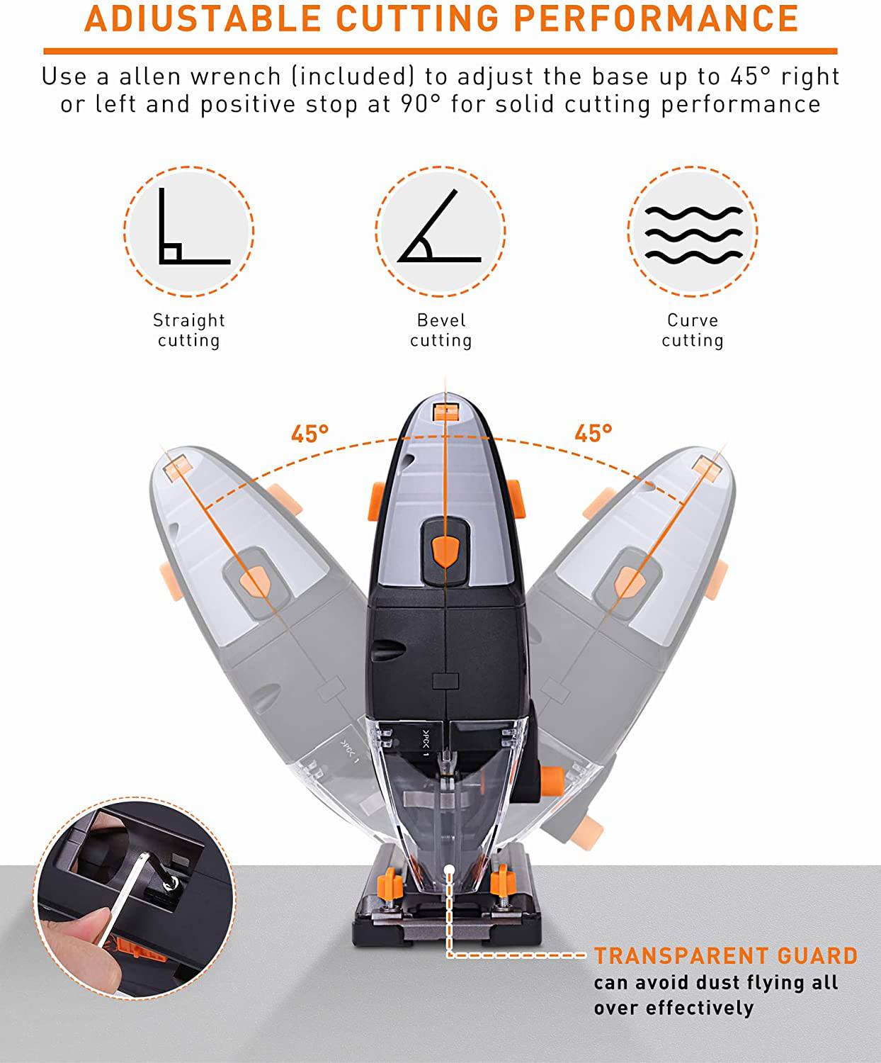 POTENCIA DE 3000 SPM Y CONFIGURACIÓN DE 6 VELOCIDADES: El motor de cobre puro de 6,7 amperios genera una potencia de corte de hasta 3000 SPM, brindando un rendimiento de corte más potente y eficiente. La velocidad variable de 6 posiciones le permite controlar la velocidad y la precisión del corte. 0 a 3 configuraciones orbitales personalizadas le permiten adaptar el movimiento de corte para adaptarse a diferentes tipos de cortes y materiales, una configuración orbital más alta para materiales más blandos y un corte más rápido, una configuración orbital más baja para materiales más duros y cortes más precisos.