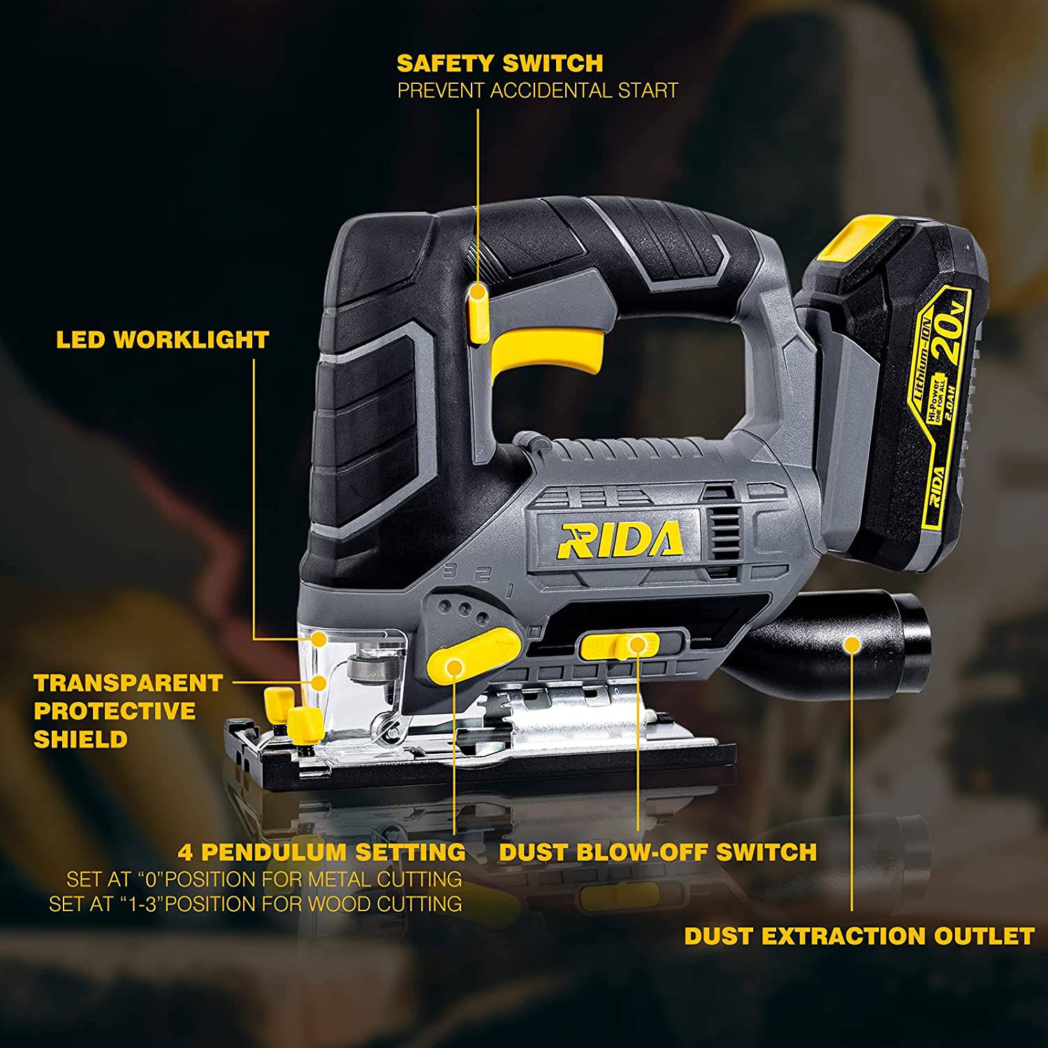 Potente capacidad de corte de 0-2700 SPM- La herramienta eléctrica RIDA pasa innumerables estudios, pruebas y una producción estricta para garantizar que cada motor y batería puedan proporcionar una potencia fuerte y estable. La sierra caladora eléctrica tiene una potente capacidad de corte, Capacidad de corte 3-1/2 pulgada (madera); 2/3 pulgadas (placa de aluminio); 1/4 de pulgada (placa de acero); La longitud de carrera de 5/6 pulgadas mejora efectivamente la eficiencia del trabajo; Stokes por Minuto hasta 2700 spm; Es fácil cortar varias formas, incluidos círculos o curvas.