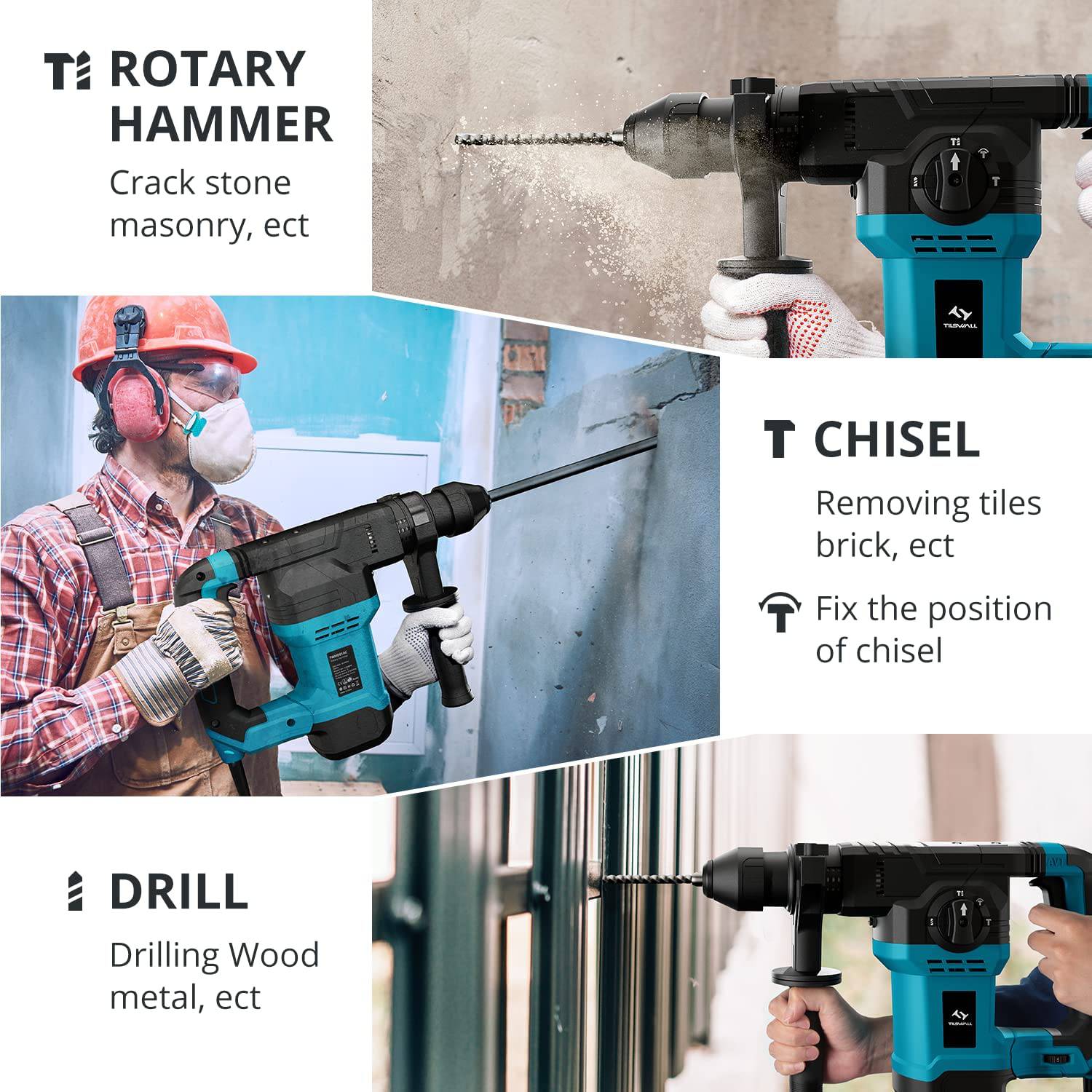 MULTIFUNCIÓN- Teclas de una función para cambiar 4 modos fácilmente. Compatible con otros taladros que no sean SDS-Plus, los martillos Tiswall SDS-Plus pueden terminar una variedad de tareas de perforación. Cambie a MARTILLO ROTATORIO para romper piedra, hormigón, mampostería, etc. La función de DRILL se adapta para taladrar madera, acero, metal, etc. Cambie a CHISEL para quitar azulejos, hormigón, ladrillo, etc. Hay una función adicional para ajustar la orientación del cincel para satisfacer sus necesidades de diferentes orientaciones durante la construcción.