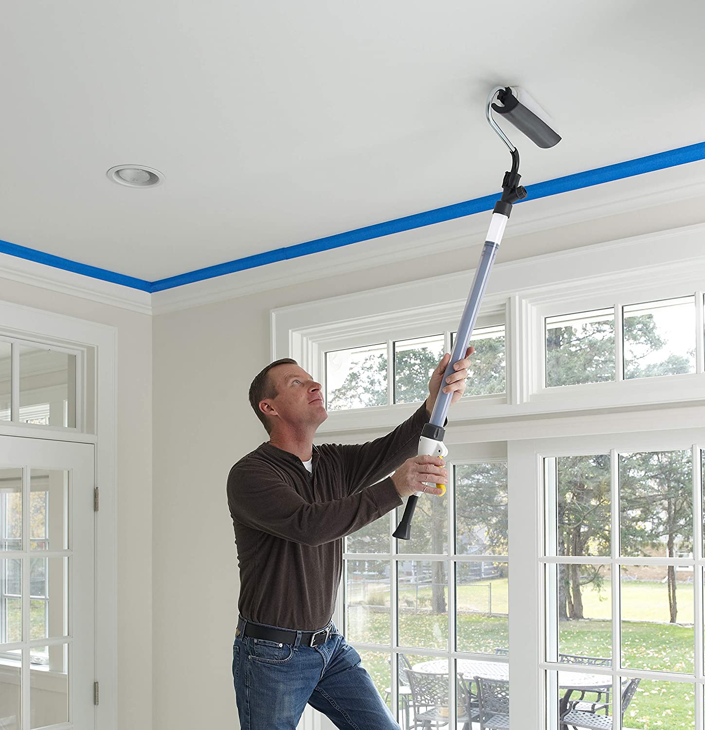 El mango extendido del rodillo de pintura le permite alcanzar techos de 8 pies sin necesidad de un poste de extensión, lo que facilita pintar paredes y techos.